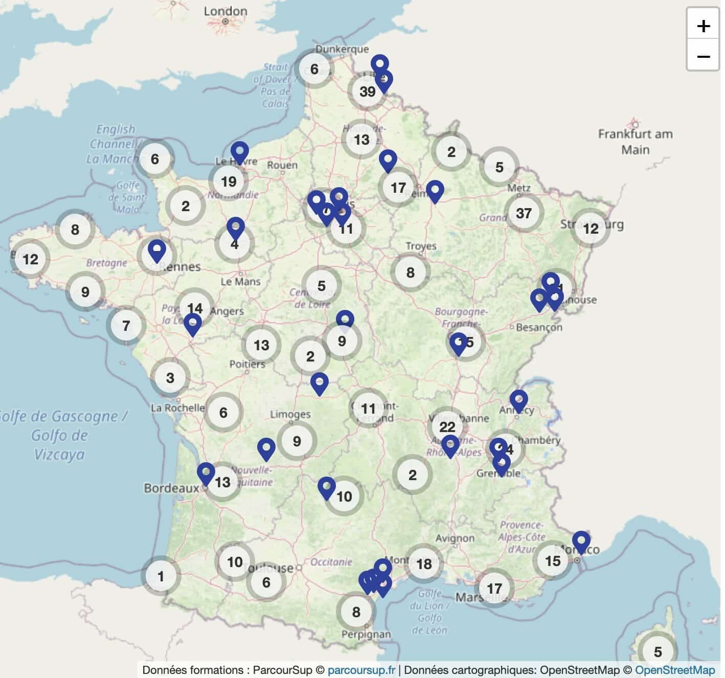 Des formations sont également encore disponibles sur Parcoursup 2022 en BUT (Bachelors Universitaires de Technologies, anciennement DUT) ; 601 au total, réparties là aussi à travers l’ensemble du territoire national (voir la carte de France ci-dessous). Grâce à la refonte de leur cursus orchestrée par les IUT en 2021, la formation est désormais réalisable en trois ans. Le BUT offre la possibilité à ses diplômés de s’orienter vers une formation bac+5, ou d’entrer directement sur le marché du travail, avec un taux d’insertion professionnelle avoisinant les 90%.