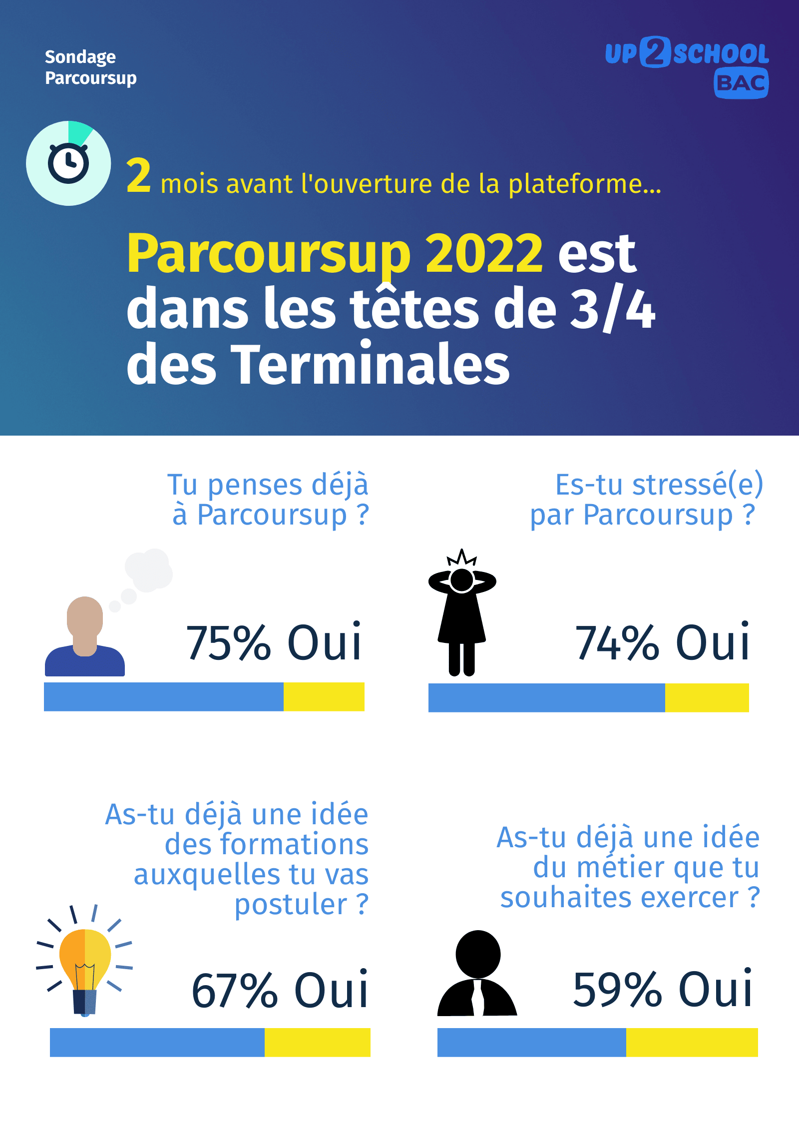Plus de deux mois avant l’ouverture de la plateforme, 3 élèves sur 4 disent déjà penser à Parcoursup. Cela représente une source de stress pour quasiment autant d’entre eux. Alors, penser à Parcoursup en terminale, c’est totalement logique, mais que ça te stresse dès le début du mois d’octobre, par contre, cela risque d’être assez contre-productif. D’ailleurs, si tu as besoin de conseils pour gérer ton stress au lycée, go lire cet article !
