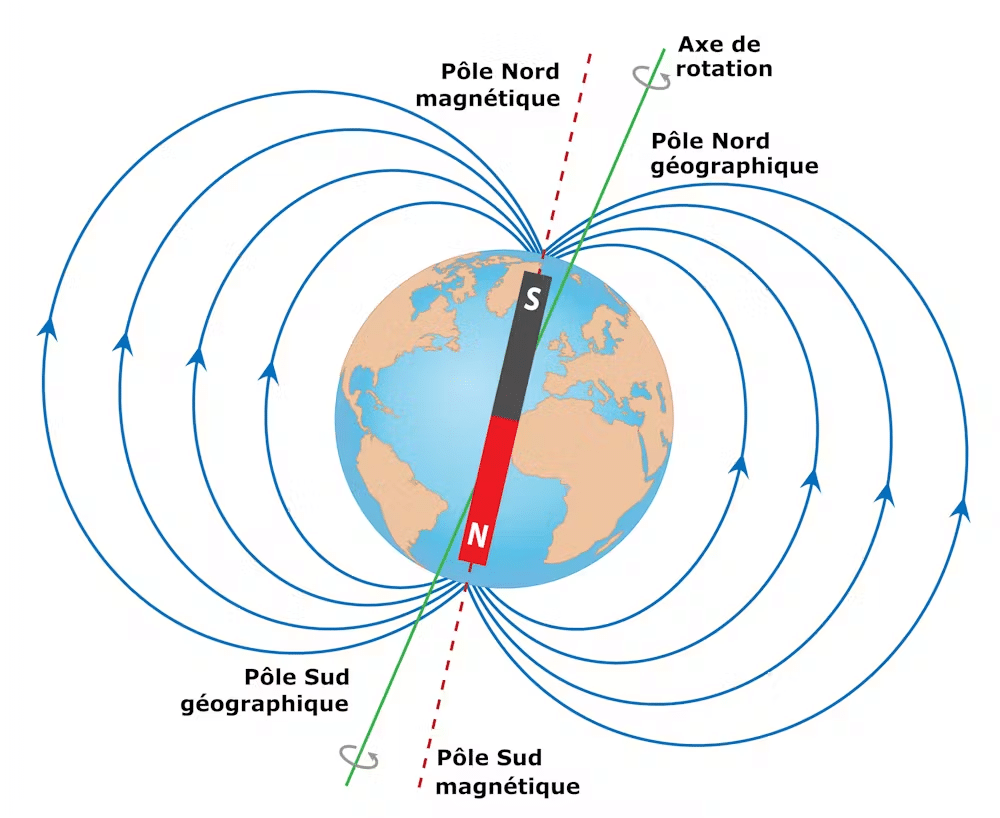 La Terre elle-même est un gigantesque dipôle magnétique. L’aiguille aimantée de ta boussole s’oriente le long des lignes de champ de ce géant invisible.
