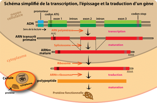 - L’ARNm primaire subit des modifications (coiffe, queue poly-A, élimination des introns et excison/réutilisation des exons) : étape centrale pour la diversité des protéines à partir d’un même gène.