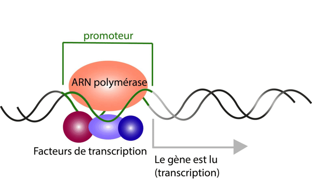 - Ce processus débute au niveau du promoteur, région de contrôle du gène, modulée par des facteurs de transcription (protéines qui peuvent « activer » ou « réprimer » la lecture du gène).