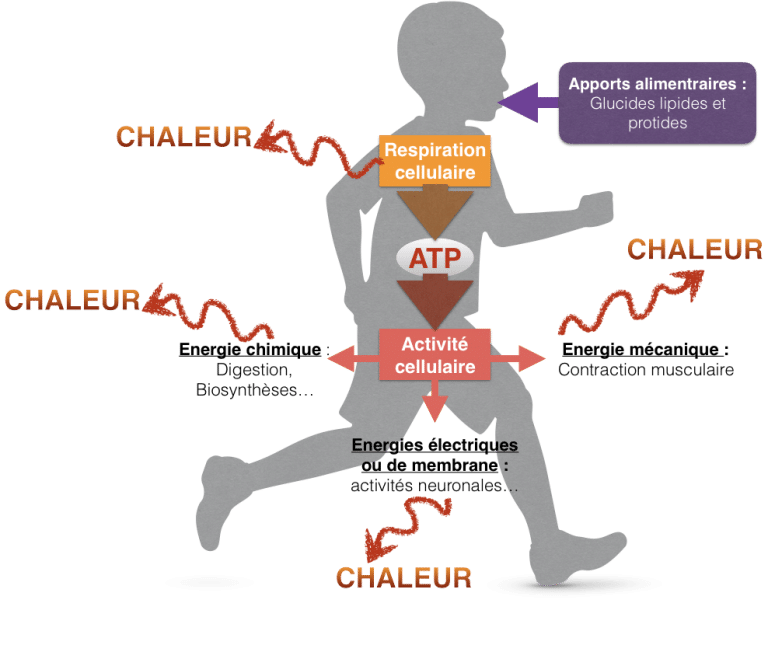 - La thermogenèse : production de chaleur (activité musculaire, métabolisme de base…)